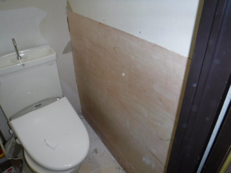 次に、ご説明するのが、下地の補強です。ワンデーリモデルトイレはカウンターと手洗いが設置されるので、しっかり壁に固定が出来るように、下地補強の板が必要です。
