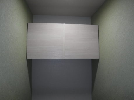対応間口750~960と、現地でカットして施工可能な 背面ウォールキャビネット。壁と壁との隙間も無くスッキリ収まります。