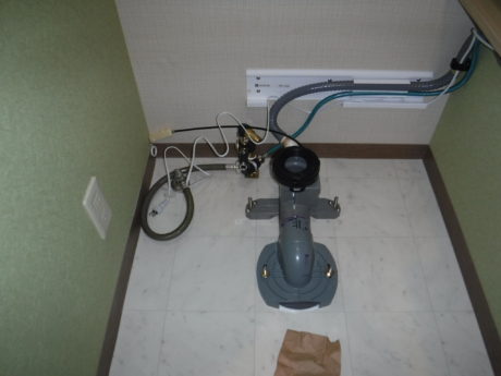 既存のトイレはタンク付き、床排水(排水芯380)でした。