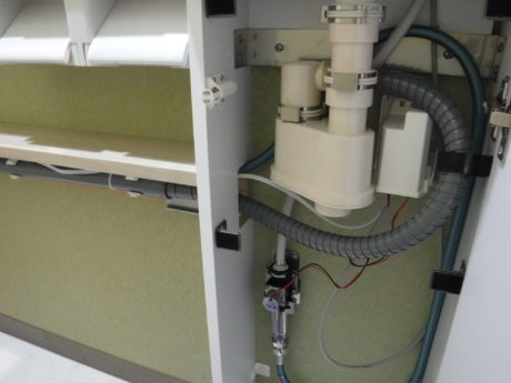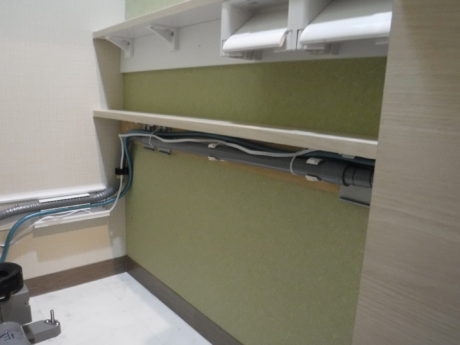以下の写真のように、2段カウンターになっていて下のカウンターの下部部分に、給水、排水、電気コード、すべて通せるようにしてあります。