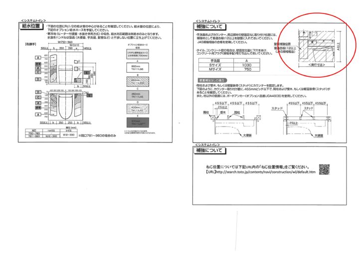 TOTOさんの施工用図面には、下地位置について、図示して説明がされています。