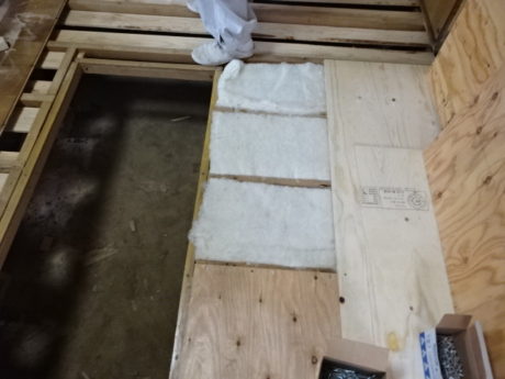 そこに今回は羊毛(ウールブレス)断熱材を根太の間に入れている途中の写真です。見るからに、床の暖かさが今までと違うだろうことが想像できると思います。