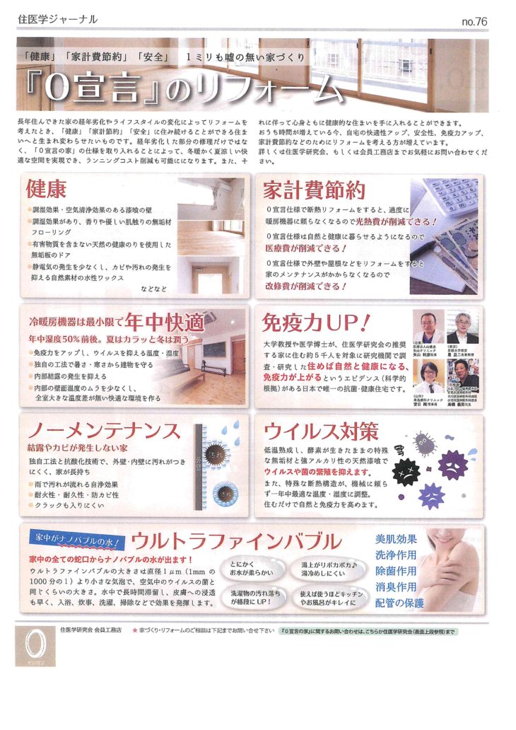0宣言の家は、病気を引き起こさない「健康な住まい」を目指して、「健康を考えたらこの建材は使えない」「この建材は安全で長持ちするのか」と疑問を抱いた工務店、設計事務所と医師や大学教授の協力のもと、調査、データーに基づいたエビデンスを確立した、仕様、素材を使った本物の家造りを追求した「住まい」です。