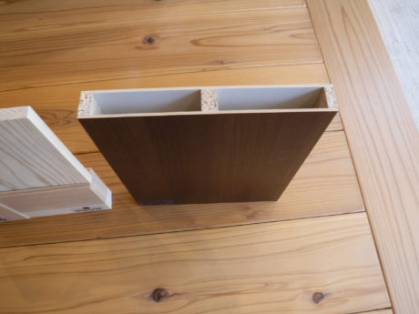 これは、下の写真にあるように、ベニヤに木目印刷シート貼り商品なので、使っているうちに、キズつきやすい角や隅の部分が剥がれてしまうからです。