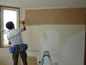 吊戸棚部分のアッパーキャビネットには、下地をコンパネにして補強します。